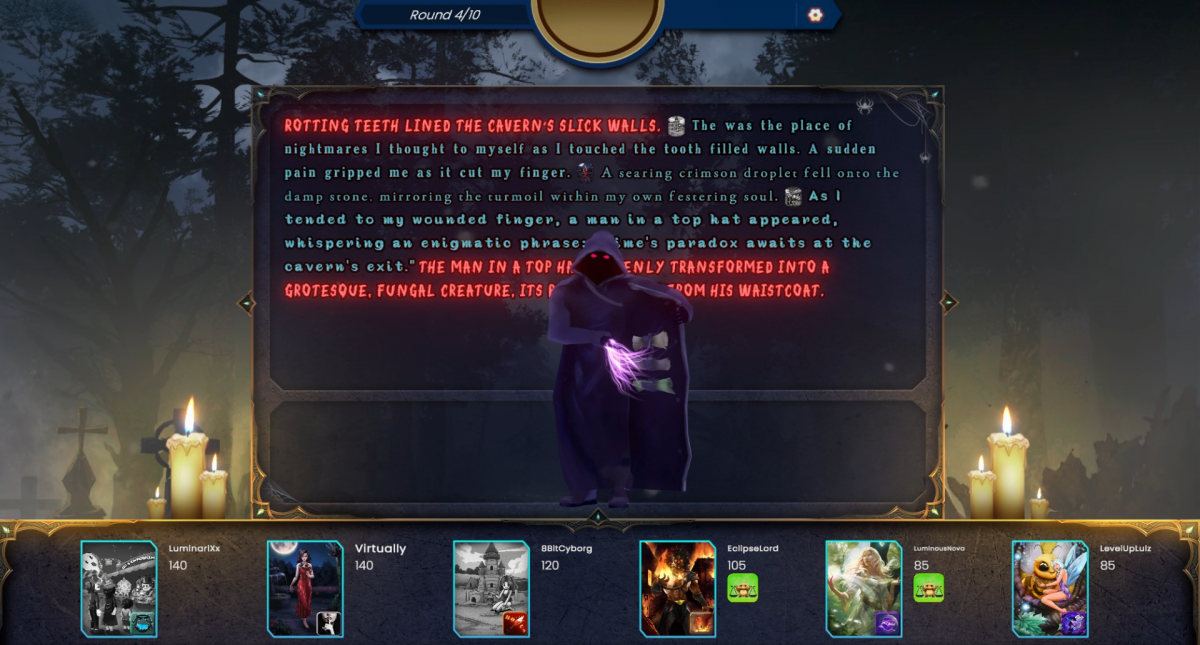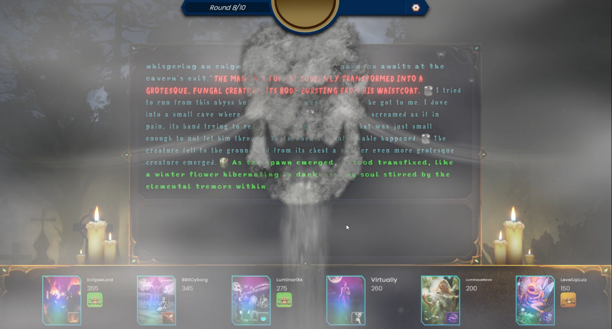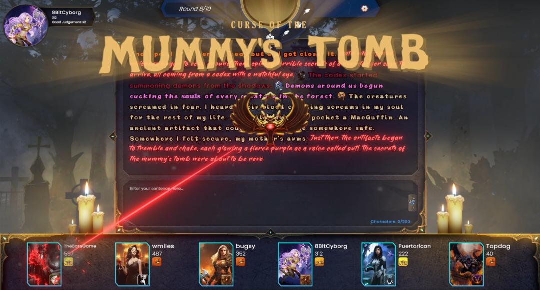 Players enter the Cursed Tomb, where the top half of the leaderboard falls victim to an ancient hex. These players must weave at least two forbidden words into their sentence while battling the challenge of a disabled spellcheck. To lift the curse and claim their points, they must also secure at least two votes in the Voting Phase—failure results in a painful point penalty.